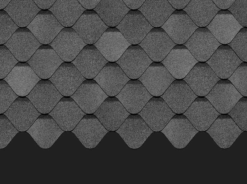 Благородный графитовый цвет подчеркивает эффектную овальную форму лепестков. Гонты создают эффект морской волны, а затемненные участки делают покрытие объемным. Черепица сочетается с нейтральными светлыми и оригинальными яркими фасадами.