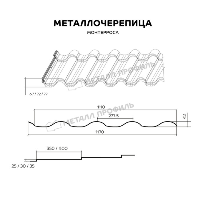 Профиль Монтерроса® выпускается с различными покрытиями из ассортимента компании «Металл Профиль». Таким образом, ваша кровля приобретает респектабельный внешний вид и долговечность. Профиль Монтерроса® органично соединяет в себе высокий рельеф и плавность линий. Несмотря на глубину волны, места соединений металлочерепицы незаметны благодаря фигурному резу нижней кромки. Оригинальные боковые крепления обеспечивают герметичность кровли. Чтобы подчеркнуть индивидуальность своего дома, при покупке черепицы вы можете выбрать высоту ступеньки (25, 30 или 35 мм) и её длину (350 или 400 мм). Металлочерепица Монтерроса® выпускается на современном оборудовании мирового класса. Это значит, что вы обязательно приобретаете долговечную и надёжную кровлю из металла.
